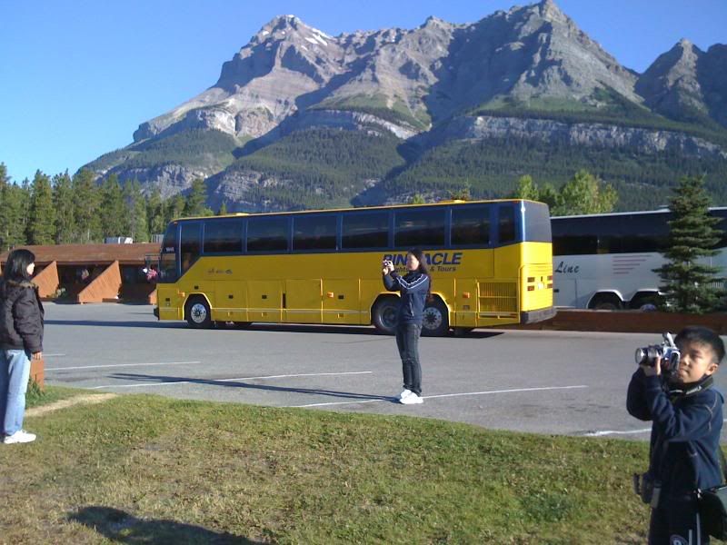 旅遊巴沿路一路爬昇,,,,,由原本翠綠既山頂,,,,漸漸見到山峰上有少許白雪,,,,因香港冇雪落,,,所以一見到雪成個人就特別興奮(尤其我是一個容易興奮的男人呢!!),由於當日陽光普照,,,所以不覺十分冷,,,,車輛會1,2個小時停一停車俾我地去解決生理需要,,,你地都知困住係車廂幾小時的感受呢!!,,,打開車門時,,,,一陣新鮮又乾又冷既空氣撲面,,,,,感覺很舒服,,,,!因導遊呀JACK呢度有大灰熊出現,,所以我每次下車都好小心向四周細心咁打量,,,睇下好唔好彩俾我揾到隻呢,,,,^^好可惜,,次次都落空呢,,,,!!@@,,,,,