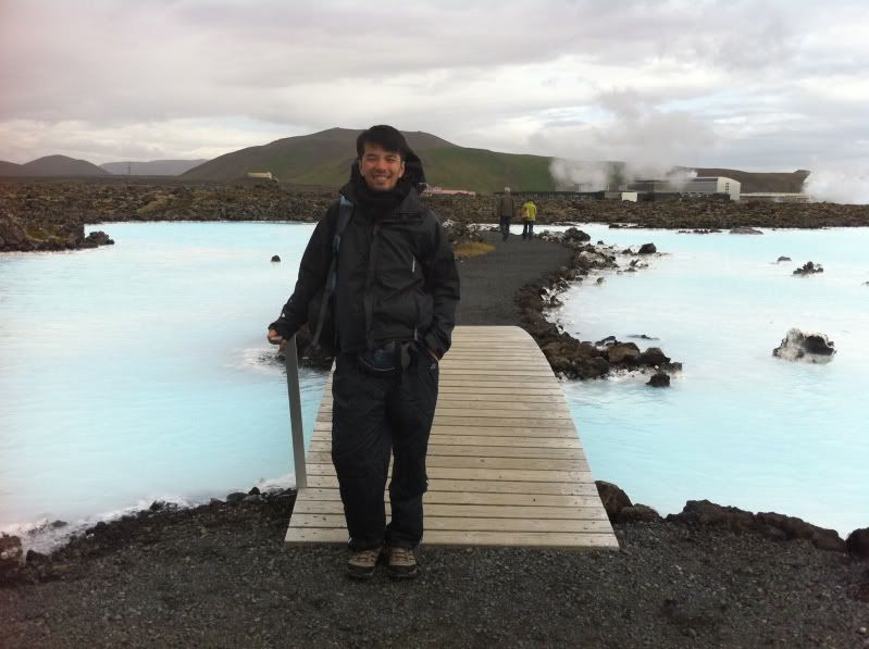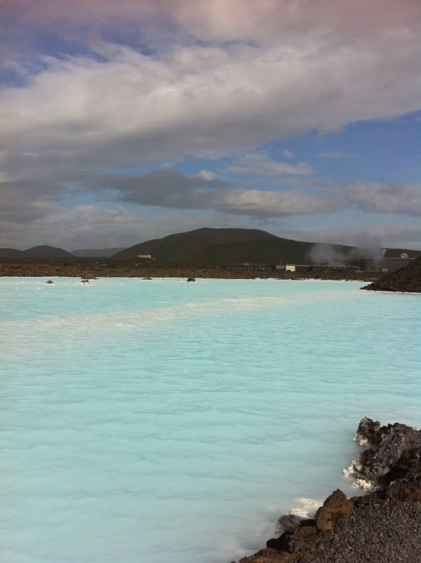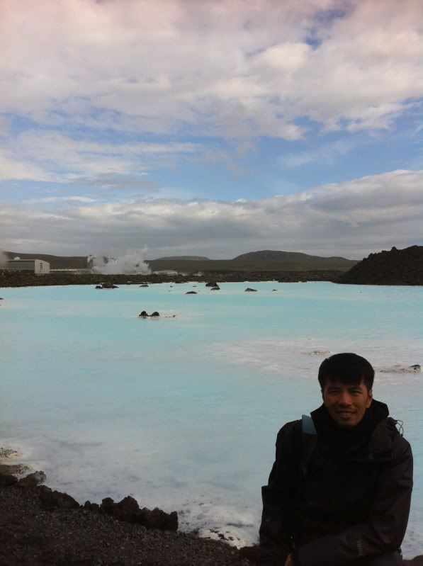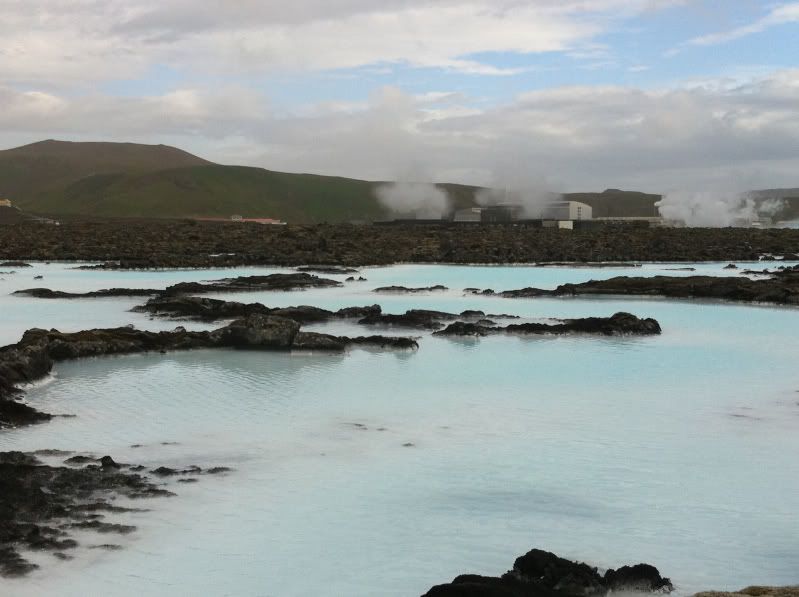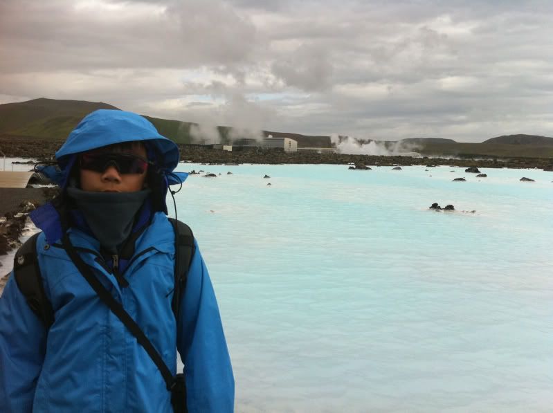 我同星魚囝都懷住興奮既心情,,,想快快步走到池邊,,,,!!但一出到池邊門口,,,,嘩!一陣非常之冷既風吹埋身,,,,,!!凍到我同星魚囝都要退回門內,,,,,!!我同星魚囝之後鼓氣勇氣,,,數了3聲就衝了出外,,,,,,掛好毛巾便跳入水晶綠色的池水裏,,,,,!!如果這一刻要問我那裏是最舒服既溫泉,,,我會答就在這裏,,,,,!!泉水是淺綠藍帶奶白,,,而溫度會因不同位置而有高低,,,,比較近出水口的會比較高,,,,,會有熱到受不了的感覺,,,,,,因水池的範圍很大,,,可以自己選擇喜歡的溫度而停留,,,,最過隱的是池底會有一層滑潺潺的東西,,,,,,用腳及手挑些上來,,,,原來是溫泉水的沉澱物,,,,,白白灰灰的,,,含極多礦物質,,,很多人都會將他直接搽上身及面上,,,,不遠處,,blue lagoon還特意放了一兩盤泥給客人自助塗泥呢,,,,!!池裏全部都是歐美人士,,,,想找到一個半個亞洲人都有點難度,,,,,我地便成了少數民族呢,,,!!浸在溫暖的池水,,,,觀看外邊冰冷的國度,,,人生幾何呀,,!!,,遠看是當地的地熱發電工廠,,,,,!!天邊的一片晶藍,,,和池水互相映襯,,,,!絕美的景色呀,,,!!